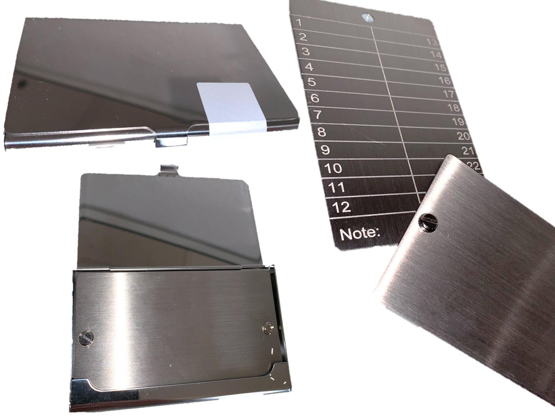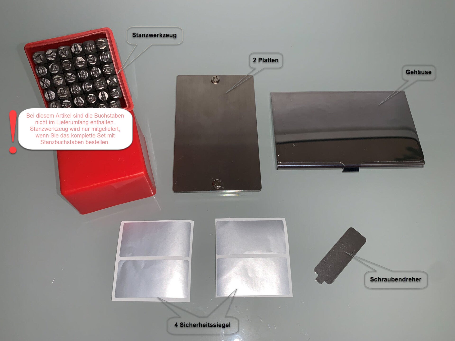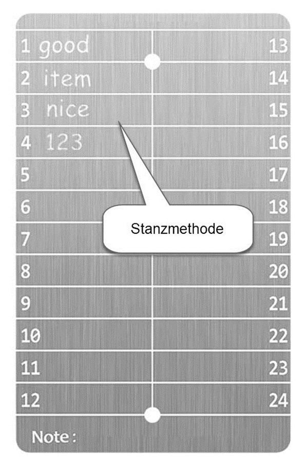 Die Edelstahlbleche funktionieren am besten mit der Stanzmethode. Aus Erfahrung raten wir von anderen Methoden ab. Sofern Sie keine passende Schlagbuchstaben und Schlagzahlen besitzen, können Sie diesen Artikel auch als Set mit passenden Schlagbuchstaben bei uns im Shop erwerben.