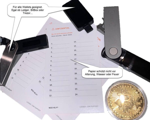 Die Recovery-Platten sind für alle 12- oder 24-Wörter Recovery Seed Phrases und funktionieren mit allen Hardware Wallets, wie z. B LEDGER, BITBOX oder TREZOR und kann ebenso für Wallets, wie z. B. METAMASK, verwendet werden.